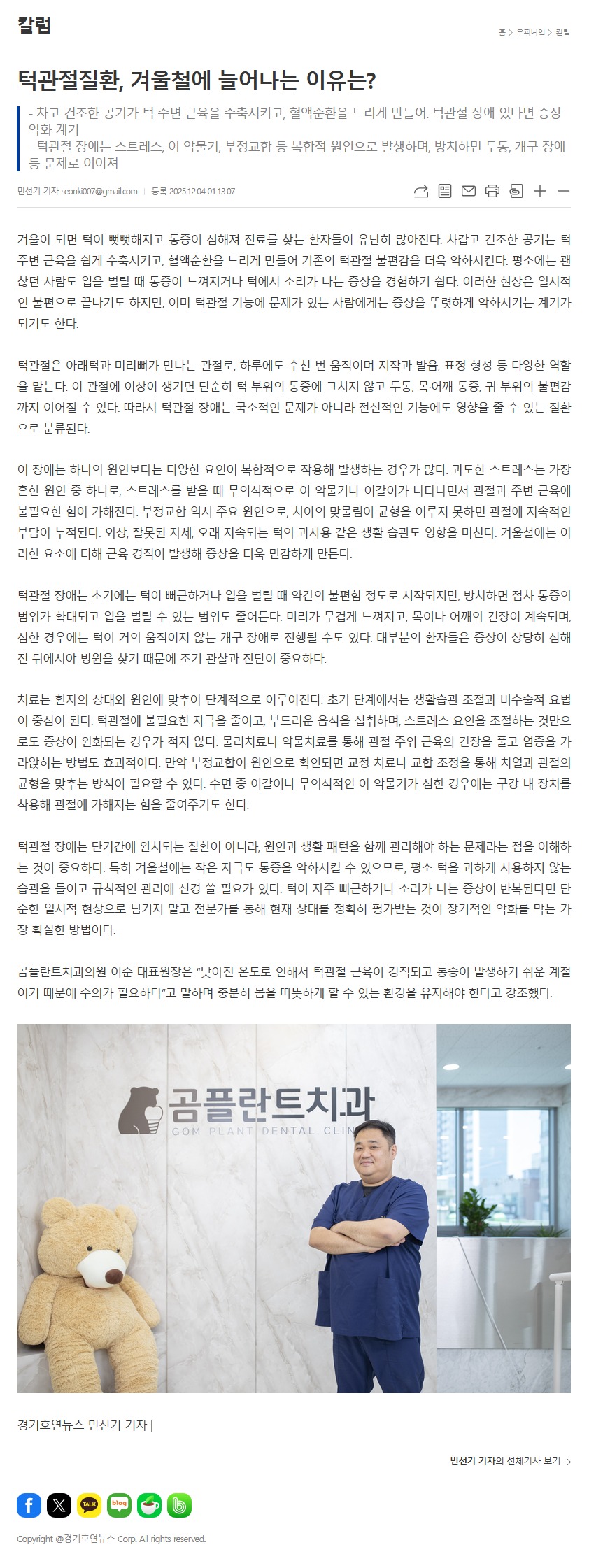 원장님 칼럼 소개 - 턱관절질환, 겨울철에 늘어나는 이유는?